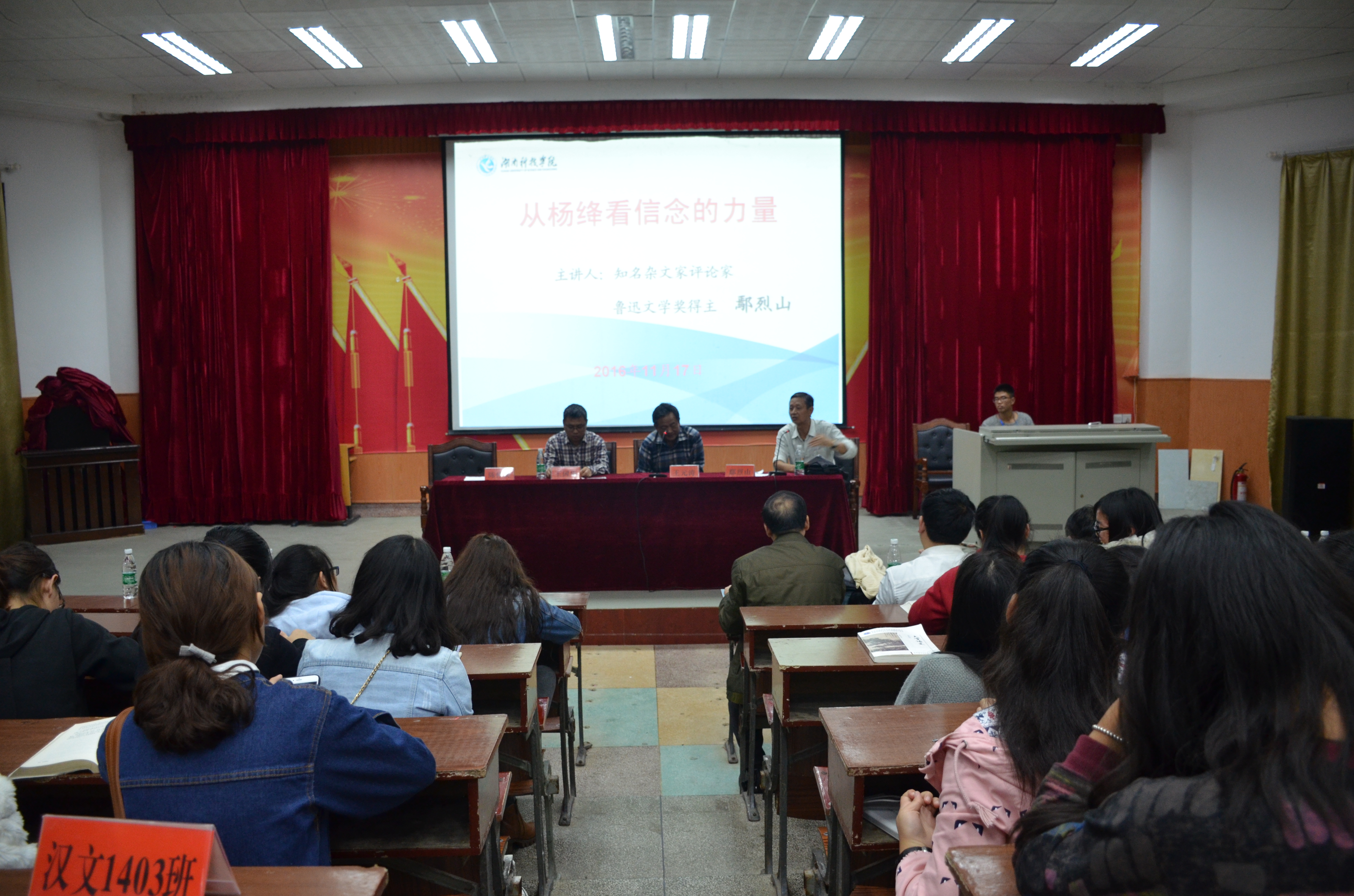 本网讯 11月17日下午,知名杂文家、时评家,原《南方周末》总编助理,鲁迅文学奖获得者鄢烈山应邀来校讲学。鄢烈山为raybet官网师生作了题为“从杨绛看信念的力量”的讲座。深圳《时代商家》杂志执行总编辑王元涛,深圳市杂文学会副会长、专栏作家王国华,当代作家、批评家、湖南师范大学新闻学院副教授、raybet官网中文系91级校友魏剑美,副校级督导、工会主席陈仲庚等出席。