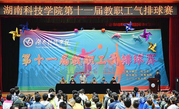 本网讯(记者 邓肖华 实习记者 洪年霞 摄影 何帅文)10月15日下午,在庄严的国歌声中,raybet官网第十一届教职工气排球赛在体育馆拉开帷幕。校党委副书记唐艳明,副校长吴小林等出席。工会常务副主席屈长青主持。