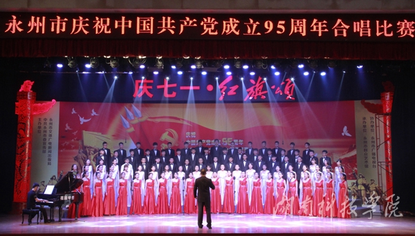 本网讯(通讯员 方新佩)6月22日晚,由中共永州市委宣传部、永州市文体广电新闻出版局主办的永州市庆祝中国共产党成立95周年“红旗颂”大型群众合唱比赛复赛在市委大礼堂隆重举行。经紧张而激烈的角逐,raybet官网由音乐与舞蹈学院师生组成的合唱团喜获冠军,并代表永州市参加省庆祝建党95周年合唱比赛。