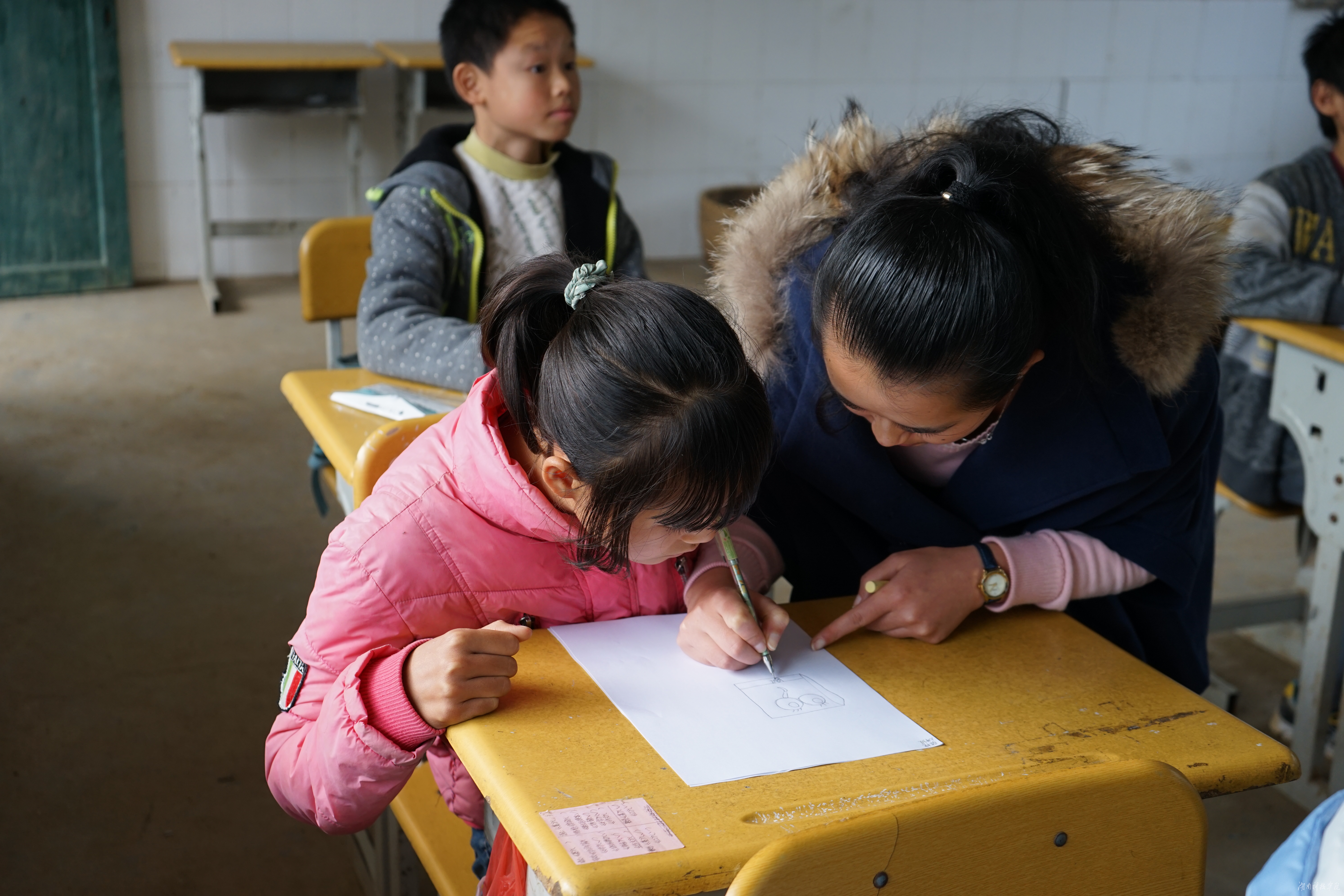 美术课上,志愿者们很认真的教孩子们画画