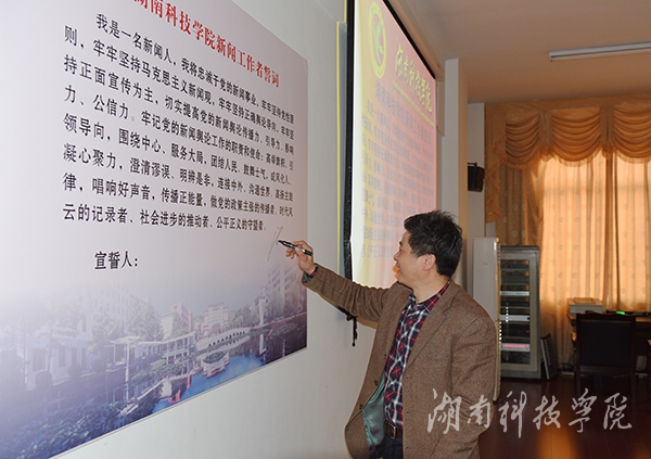 传媒学院宣传委员肖可说,高校传媒学院担负着培养新闻人才的重任,有责任有义务培养一批政治坚定、理论知识扎实、专业技能过硬的人才,要在学生中深入开展马克思主义新闻观教育,创新教育教学方式,教育和引导学生自觉地做党的政策主张的传播者、时代风云的记录者、社会进步的推动者、公平正义的守望者。