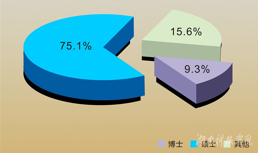 师资队伍数量、质量和结构日趋合理。目前在职教职工1042人,其中专任教师630人。专任教师中具有正高职称61人、副高职称182人,具有高级职称的教师占专任教师比38.6%,相较于2010年12月底,同比增长8.5%;具有博士学位59人、硕士学位473人,具有硕士以上学位的教师占专任教师比84.4%,相较于2010年12月底,同比增长10.7%。现有湖南省“新世纪121人才工程”第三层次人选7人,湖南省学科带头人及其培养对象5人,省青年骨干教师及其培养对象49人,同比增长17人。