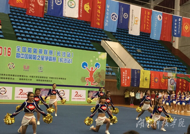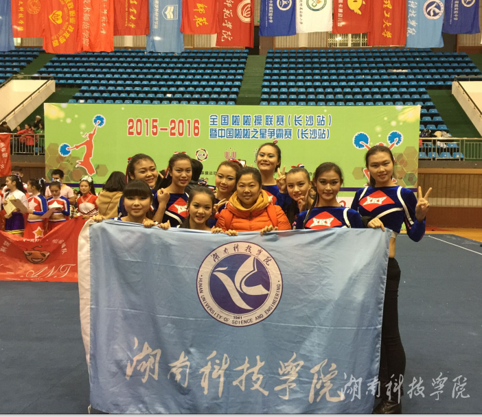 本网讯 12月5日至6日,由国家体育总局体操运动管理中心、教育部和中国大学生体育协会联合主办的2015年全国啦啦操联赛暨中国啦啦操之星争霸赛(长沙站)在湖南师范大学举行。raybet官网体育学院2014级同学组成的啦啦操队,荣获大学组集体技巧二级规定动作第一名,花球舞蹈自选动作第五名,盘华老师荣获优秀教练员称号。