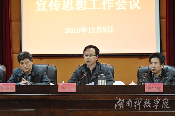 陈弘在会上发表讲话。他强调,意识形态工作关系到国家安全,关系到党的执政地位,学校全体领导干部要把宣传工作放在心里、挂在嘴上、落实在工作上。做好宣传思想工作,务必要坚持三个原则:一是要坚持正确的政治方向,自觉维护党的权威、维护国家安全、维护社会稳定;二是要坚持宣传好社会主义核心价值观,弘扬传承中华文明,让正确的舆论和正义的声音始终主导校园 ;三是要坚持创新,以生动活泼、喜闻乐见的形式开展工作,严把内容关、方向关,接地气、贴民心,改进文风、会风。重点要落实三项任务,一是必须要营造良好的政治生态,凝聚校园正能量;二是要宣传党委的办学思想、办学理念;三是营造浓厚的文化氛围,优化育人环境,努力把学生培养成为专业精湛、品德高尚、政治可靠的社会主义事业的合格建设者和接班人。