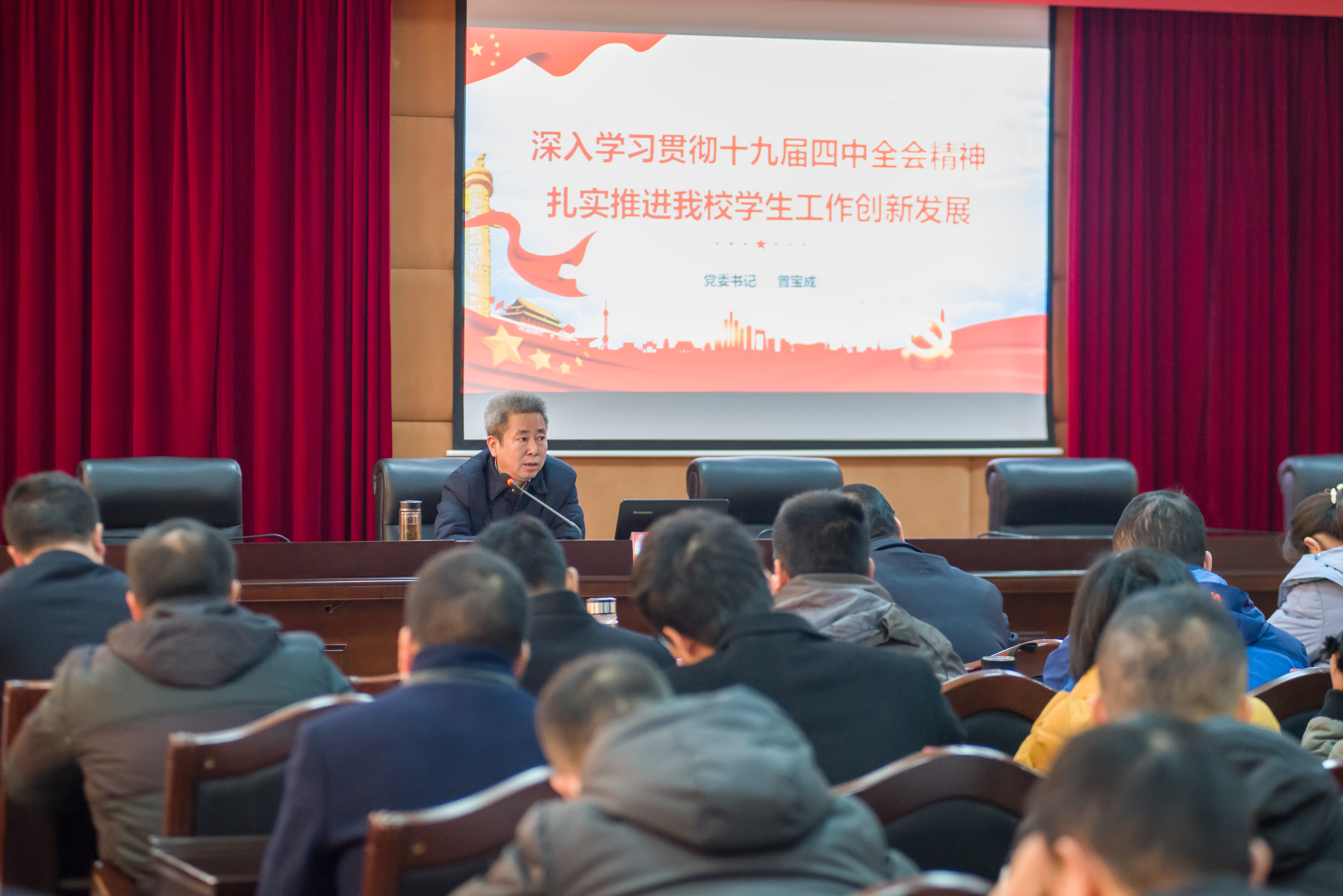 校党委书记曾宝成以《深入学习贯彻十九届四中全会精神,扎实推进raybet官网学生工作创新发展》为题作培训第一讲。他从十九届四中全会的重大意义、基本内容、十三个方面“显著优势”、总体目标、十三个坚持和完善以及重大战略任务六个部分入手,与全体学工队伍一起系统而深刻地学习了十九届四中全会精神。他指出,落实立德树人根本任务,必须抓住理想信念铸魂这个关键、构建多方协同的育人格局、创新学生工作的方式方法、提升学生工作的科学化水平、营造浓厚的校园文化氛围、发挥党组织的战斗堡垒作用和共产党员先锋模范作用。
