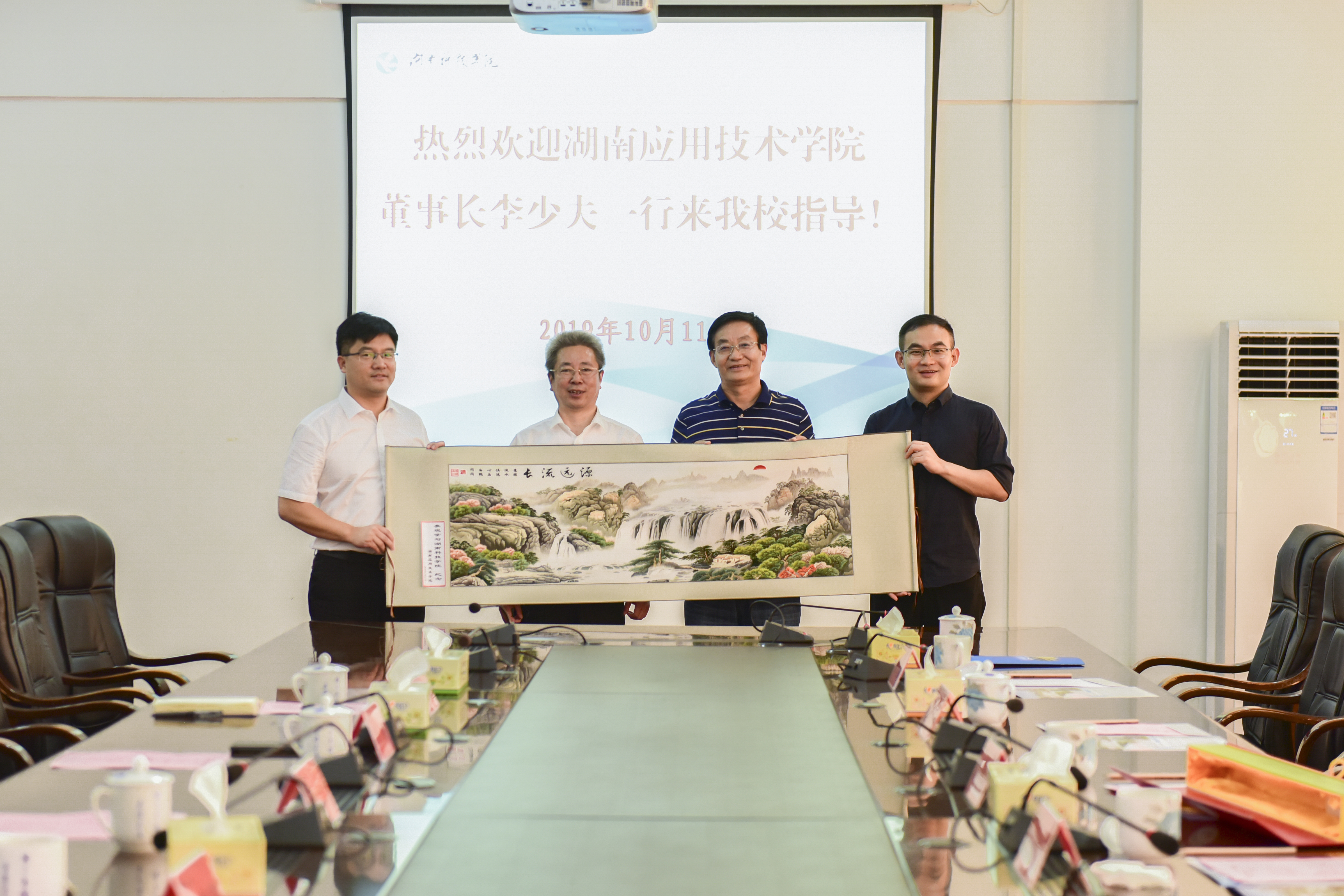 本网讯 10月11日,湖南应用技术学院董事长李少夫,副董事长齐淑兰,校长李旋旗,党委委员、常务副校长李敏以及人事处、设计学院负责人来学校交流访问。学校党委书记曾宝成,校长李钢,党委副书记、工会主席唐艳明参加工作交流会,会议由李钢主持。