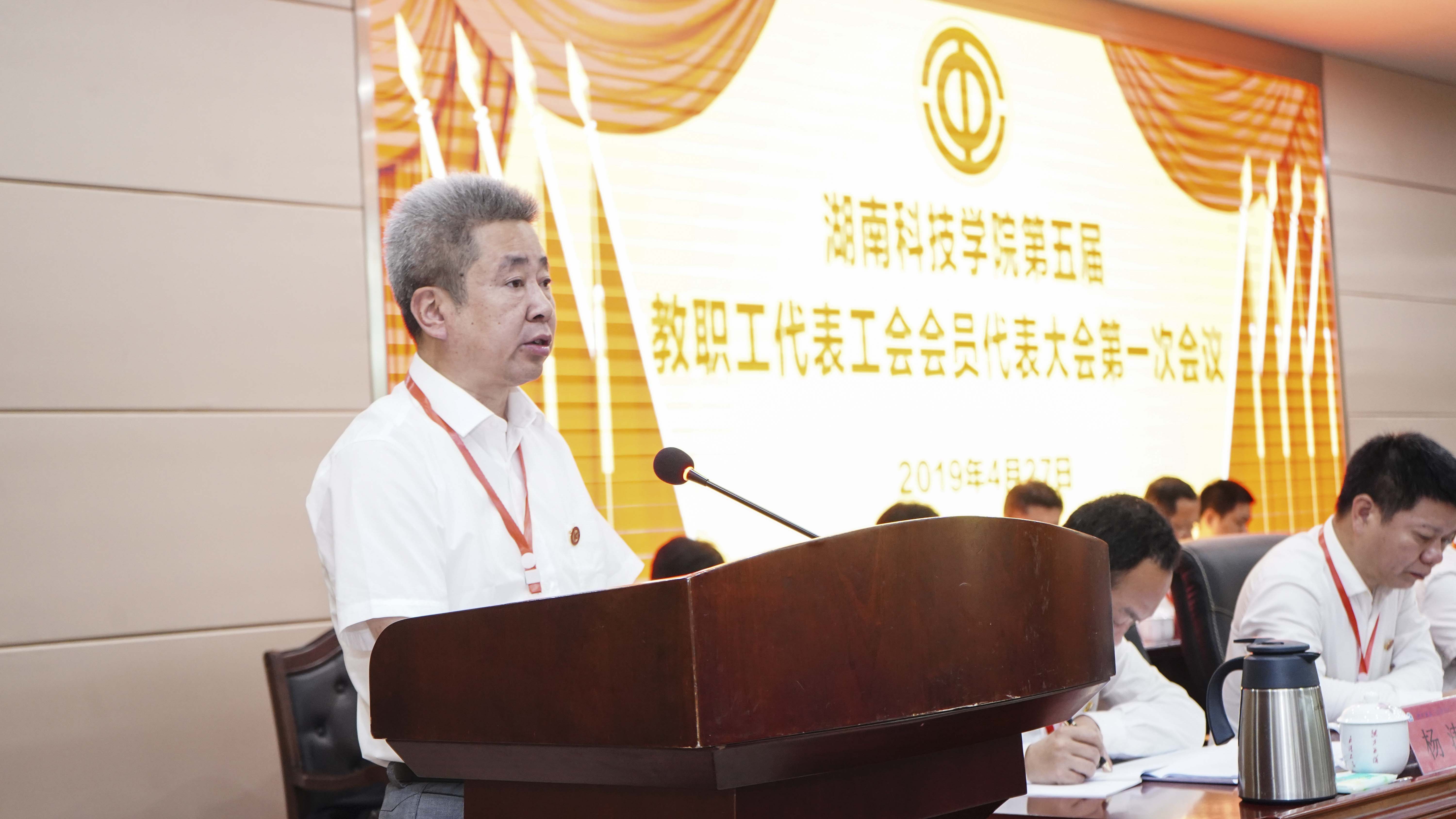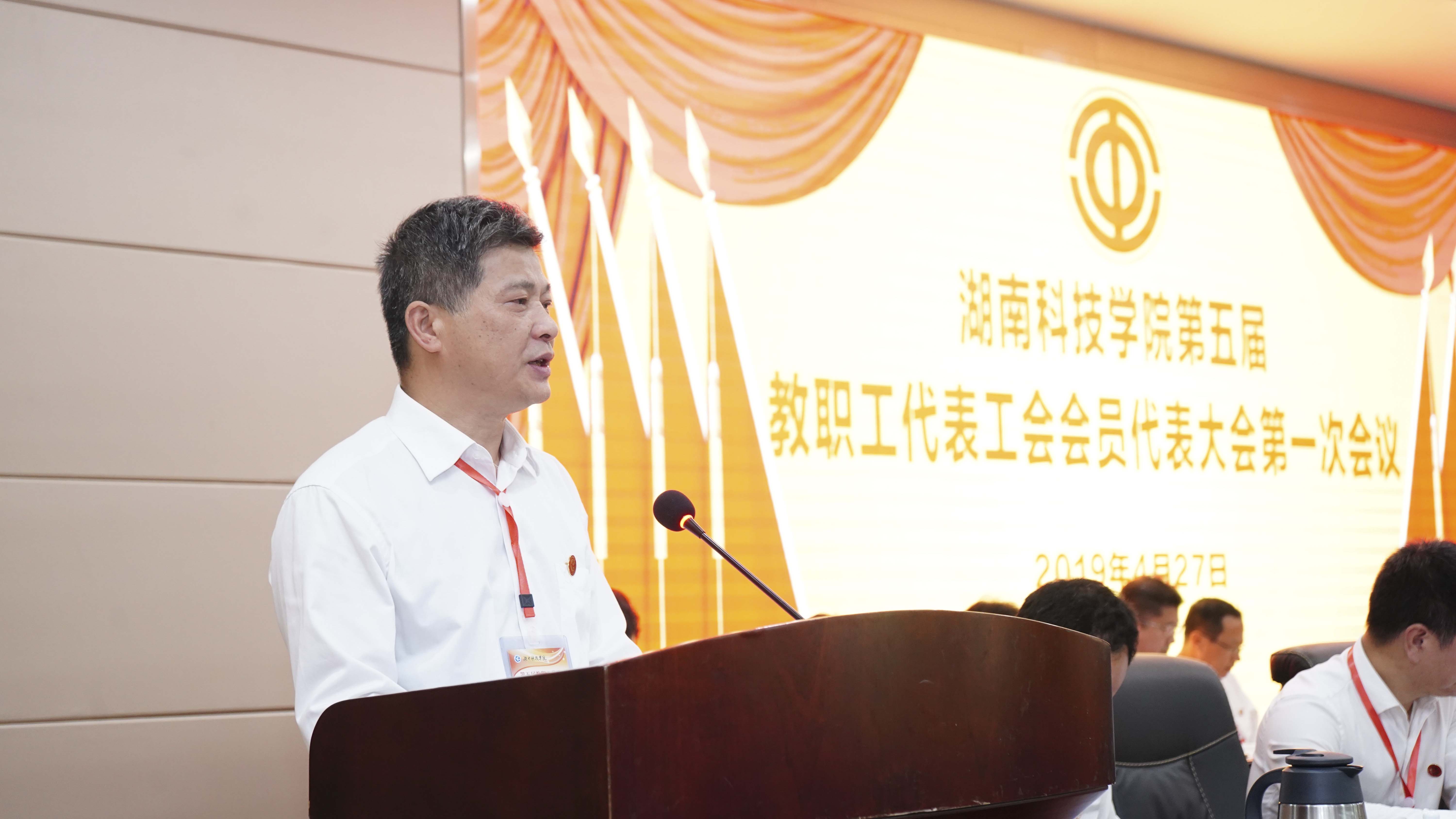 本网讯 “春秋多佳日,登高赋新诗。”在春意盎然的美好时节,4月27日上午,学校第五届教职工代表工会会员代表大会第一次会议在潇湘大讲堂开幕。省教育工会主席高新明应邀出席,大会主席团成员曾宝成、唐艳明、宋宏福、彭立威、郑山明、李常健、吴小林、程智开、何福林、杨涛等 21人在主席台就坐。正式代表、特邀代表和列席代表200余人齐聚一堂,共商学校改革发展大计。