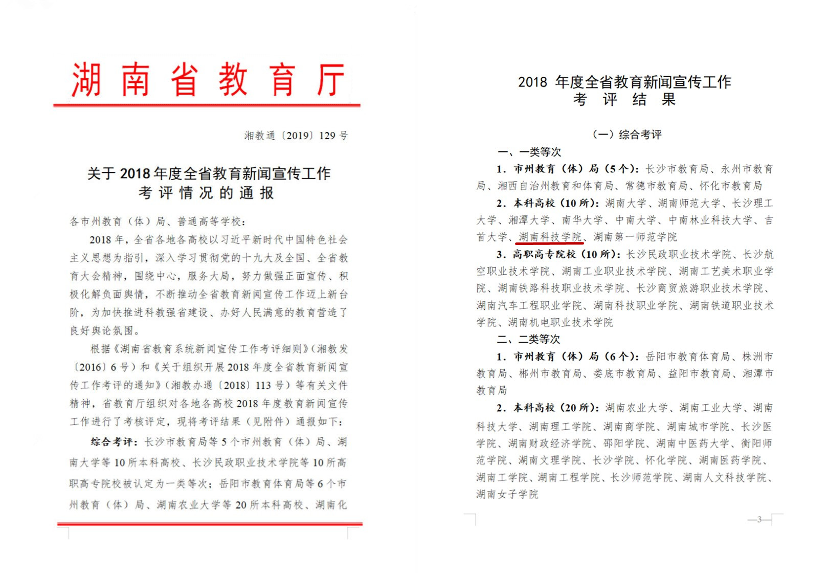 本网讯 近日,湖南省教育厅下发《关于2018年度全省教育新闻宣传工作考评情况的通报》,raybet官网在2018年度全省教育新闻宣传工作综合考评中获评一类等次(优秀),这是raybet官网第四次获此殊荣。