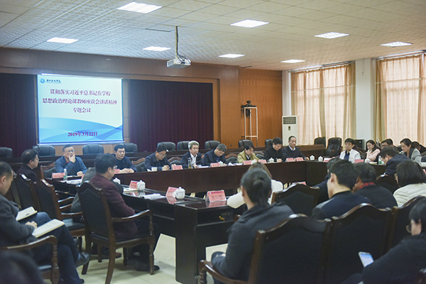 本网讯 3月22日,学校举行党委理论学习中心组(扩大)学习,专题学习贯彻习近平总书记在学校思想政治理论课教师座谈会上的重要讲话精神。党委书记、校长、学校思想政治工作领导小组组长曾宝成,校领导唐艳明、彭立威、李常健、吴小林、程智开及学校思想政治工作领导小组其他成员,马克思主义学院全体教师,各教学学院党总支副书记、全体辅导员,教师教育学院院长等参加会议。会议由党委副书记唐艳明主持。