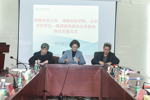 本网讯 3月12日下午,学校与湖南农业大学、永州经开区举行合作签约仪式,共同签订了《湖南农业大学和雷竞技raybet官网版下载科技支撑永州经开区植提基地建设合作框架协议》。湖南农科院党委书记柏连阳教授,湖南农业大学曾建国教授,永州经开区党委副书记、管委会主任李瑛,校党委书记、校长曾宝成,副校长宋宏福,化学与生物工程学院负责人和相关学科团队负责人参加仪式。仪式由宋宏福主持。