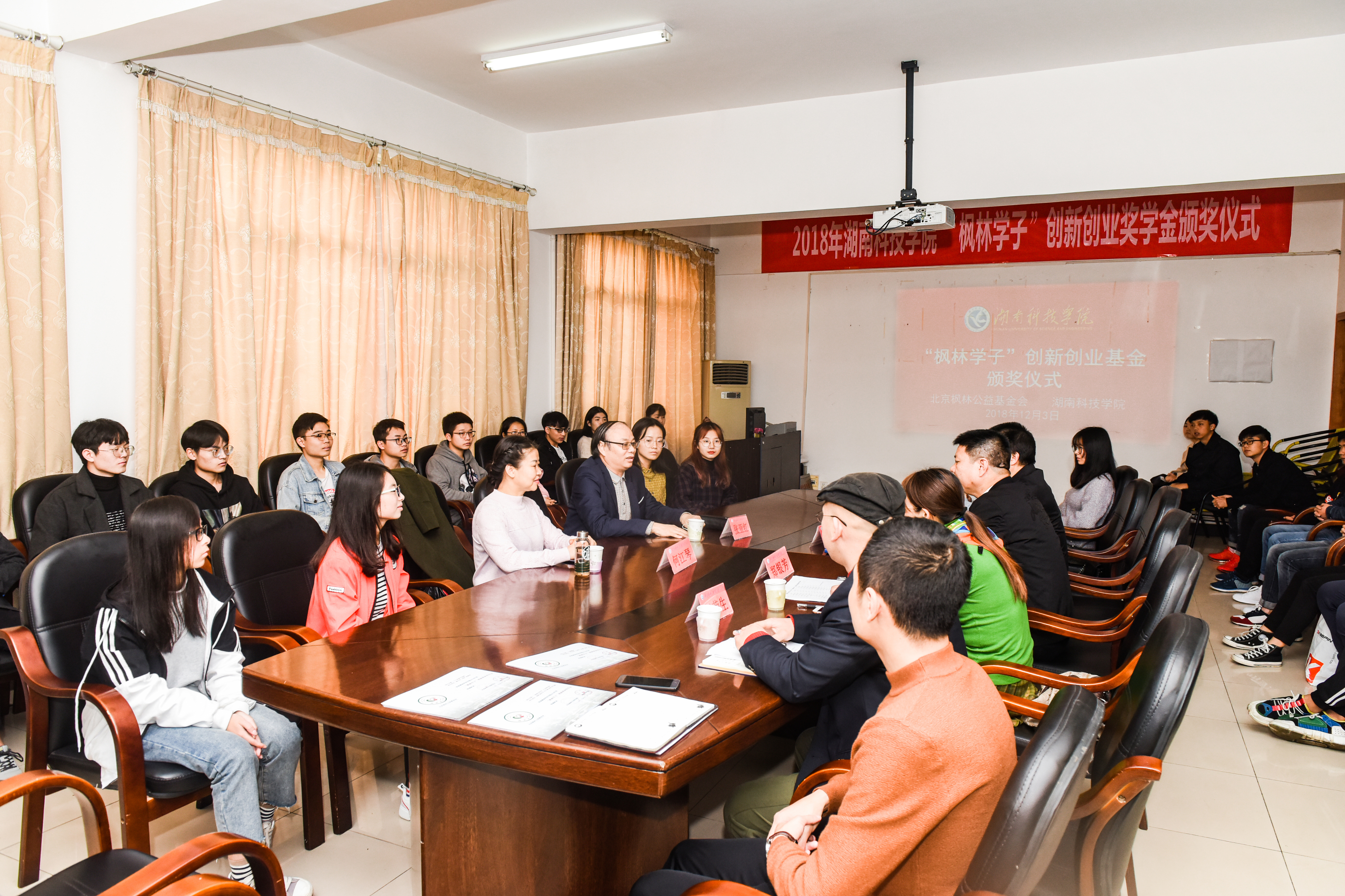 本网讯 12月3日下午,学校举行首届“枫林学子”创新创业奖学金颁奖仪式。副校长程智开,学校77级校友、北京校友会会长、北京枫林公益基金会会长张亚红,北京枫林公益基金会秘书长何江琴共同为44个获奖项目颁奖。
