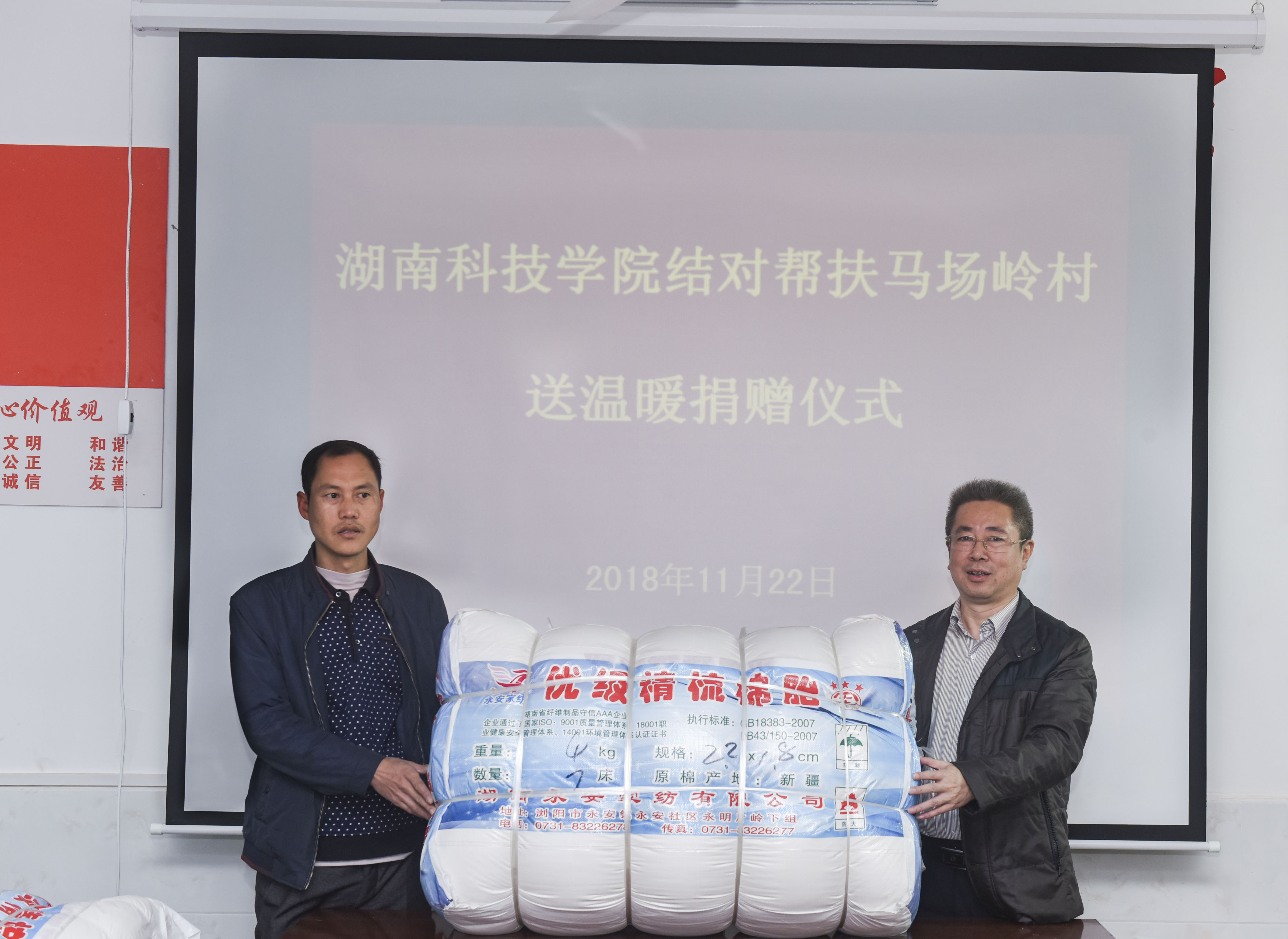 曾宝成代表学校为全村499户家庭赠送了棉被等生活物资,并向村民们转达全体教职工的问候。随后,校领导、中层干部开展入户走访,仔细询问村民的生产生活状况,鼓励他们要增强信心,勇敢面对困难,积极发展生产,争取早日脱贫致富。