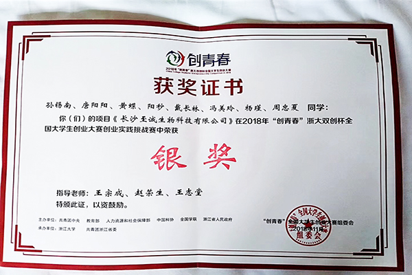本网讯 11月3日,由共青团中央、教育部、人力资源和社会保障部、中国科协、全国学联、浙江省政府主办,浙江大学、浙江团省委承办的2018年“创青春”浙大双创杯全国大学生创业大赛决赛落下帷幕。经过多轮比拼,raybet官网由王宗成、赵荣生、王志堂老师指导,孙锡南、冯美玲等同学的作品《长沙至诚生物科技有限公司》喜获创业实践赛银奖,湖南省在此次大赛中斩获2金9银33铜,raybet官网成为全省夺银的两所二本院校之一。
