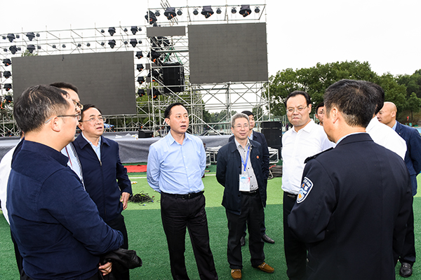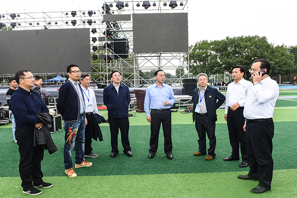 赵应云一行首先来到文化广场参观“永州之野”农产品、机器人产品、长丰猎豹汽车以及永州非遗文化等展览,随后来到田径场、体育馆等比赛场地,查看开幕式的舞台建设、文艺表演、安保、场地布置、后勤保障、赛事组织等准备情况,并听取相关负责人的现场汇报。赵应云对赛事前期准备工作给予充分肯定,并要求各级相关部门要全力做好赛事工作,确保大赛顺利进行。