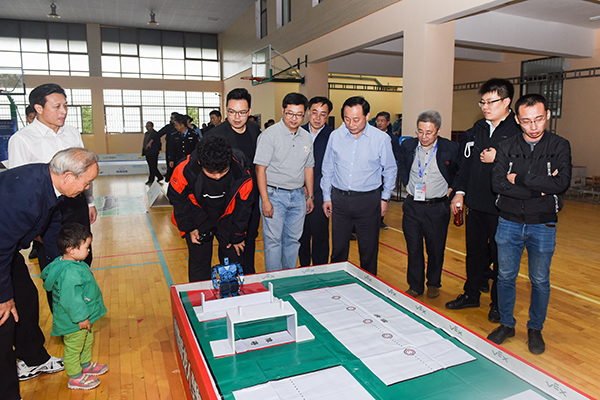 本网讯 10月18日下午,市委副书记、市长赵应云来校调研,现场调度2018“猎豹汽车”杯首届中国青少年人工智能机器人大赛暨第九届亚洲机器人锦标赛VEX中国选拔赛的筹备工作,市政府秘书长陈宇荣,校长曾宝成、副校长宋宏福陪同。