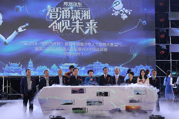 永州市委书记、市人大常委会主任李晖宣布2018“猎豹汽车杯”首届中国青少年人工智能大赛暨第九届亚洲机器人锦标赛VEX中国选拔赛开幕。中国民办教育协会副会长郑增仪,全国智能机器人创新联盟常务副理事长、中国人工智能产品与产业工作委员会主任韩力群,亚洲机器人联盟主席梁钟铭,湖南省经济和信息化委员会副巡视员廖廷球,永州市委副书记、市长赵应云,市政协主席蒋善生,市委常委、常务副市长张贺文,市委常委、市委秘书长唐能武,市人大常委会副主任袁火林,校长曾宝成及其他在校校领导出席开幕式。