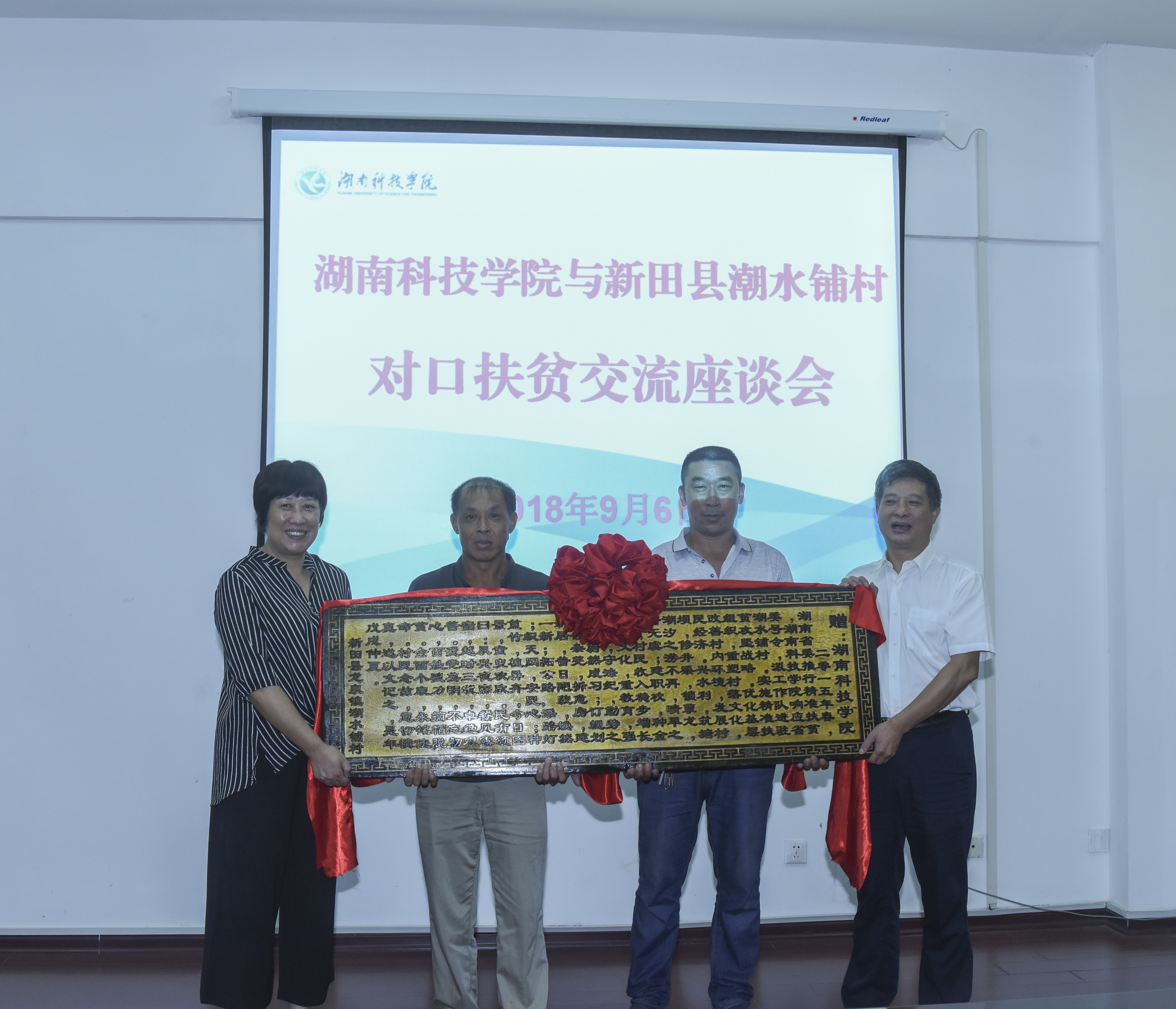本网讯 9月6日上午,新田县潮水铺村两委班子来校赠送感谢牌匾,并座谈交流对口扶贫工作。党委副书记唐艳明主持座谈会,原驻村扶贫工作队队长贺幸福等有关部门负责人参加。