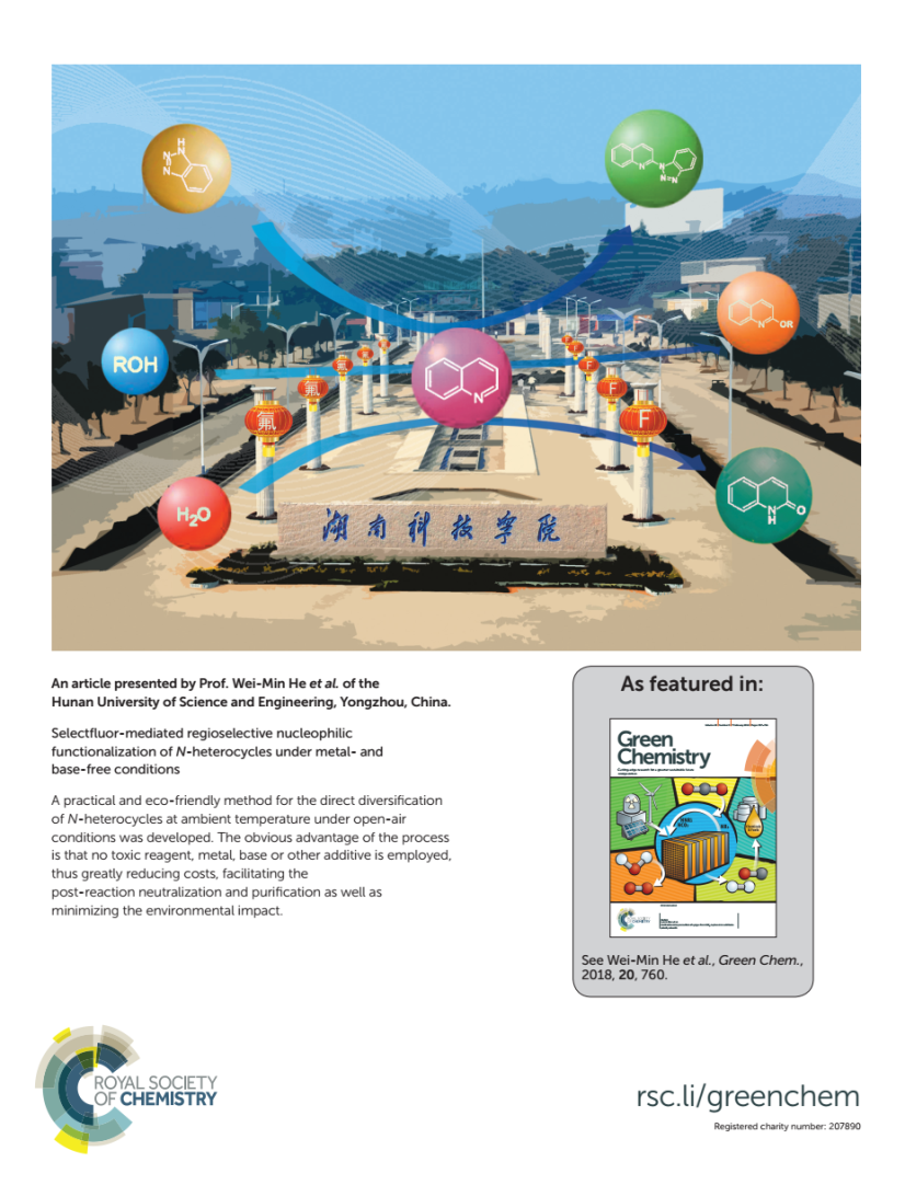 本网讯 近日,国际顶级期刊Green Chemistry(影响因子9.125)发表了raybet官网化学与生物工程学院有机化学研究团队谢龙勇博士在绿色有机合成研究领域取得的最新研究成果。此项研究成果同时也被遴选为当期封底论文,并首次以raybet官网标志性建筑潇湘广场为封底背景。