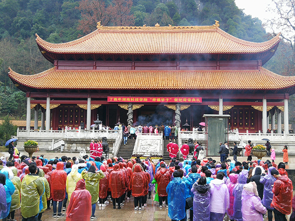 “舜德学子”祭祀舜帝典礼上,副校长程智开与湖南省舜文化研究会会长、工会主席陈仲庚带领舜德学子朝拜帝舜。