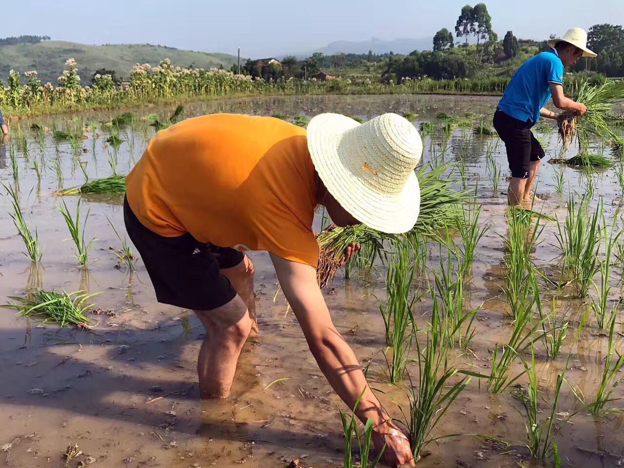 眼下正值烟田翻耕移栽晚稻秧苗时节,新夏荣村的烟农都忙着插秧。贫困户陈远贞的父母丧失了劳动能力,家里劳动力缺乏,雷竞技raybet官网版下载实践帮扶小组在了解到情况后马上赶来帮忙。他们卷起裤腿踏入田地,拿起秧苗和陈远贞一起认真的插了起来。虽然天气炎热,大家忙得满头大汗,但是并没有任何松懈,经过一天的辛苦劳作,陈远贞家里的三亩田全部插完。
