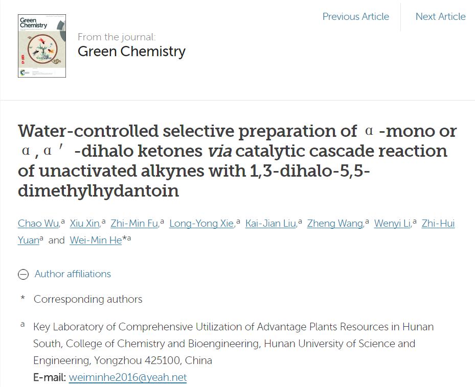 本网讯 近日,raybet官网化学与生物工程学院吴超博士以第一作者身份,报道了一种绿色环保、可持续性的低成本选择性合成α-单卤代酮和α,α-二卤代酮的新方法,这一成果发表在英国皇家化学会高端SCI学术期刊Green Chemistry上,影响因子8.5,中科院分区大类一区。