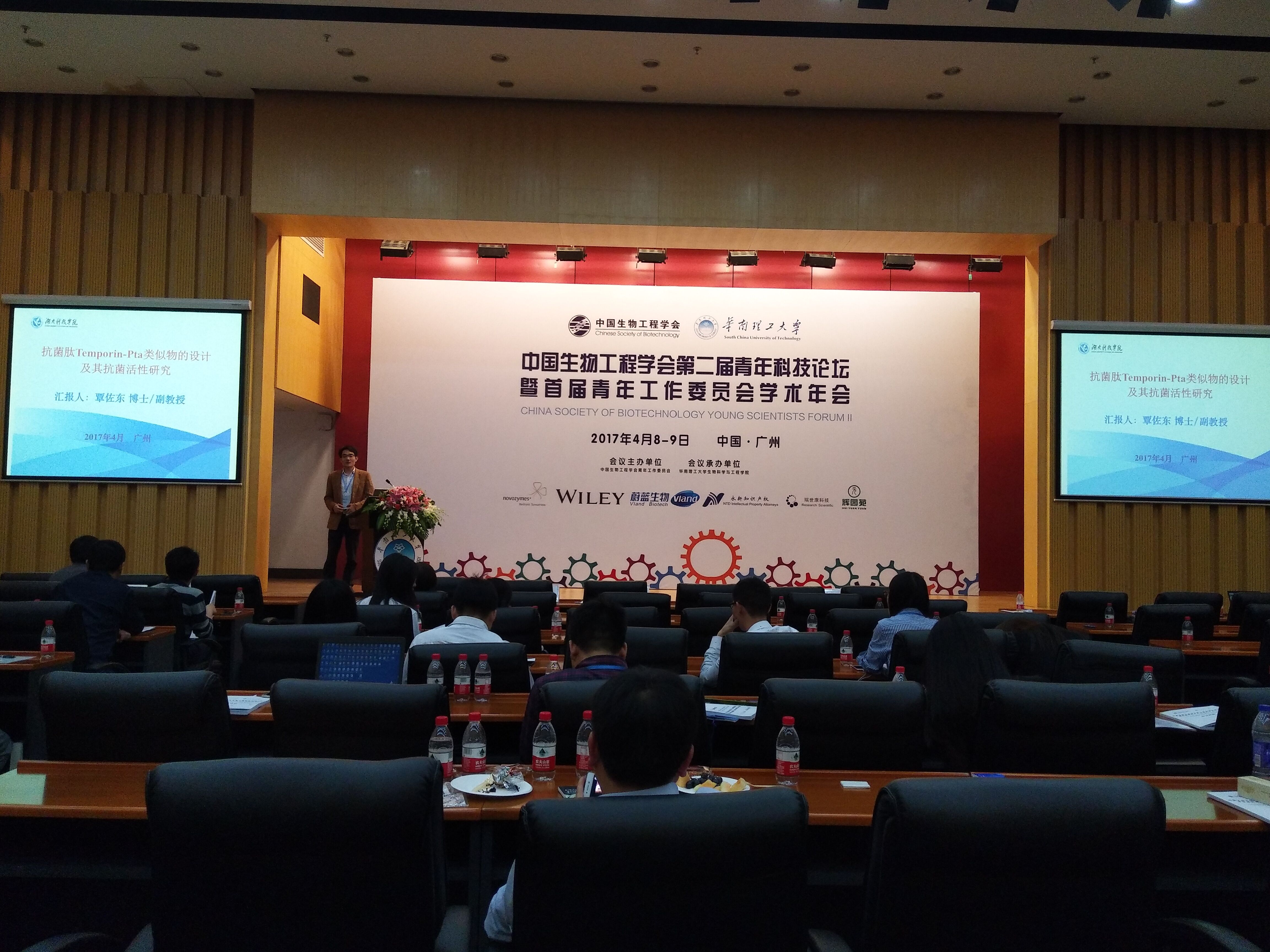 此次会议是生物化工领域高学术水平和富有成果的盛会,不仅有国内外享有盛誉的专家分享宝贵经验,各分会场青年学者也纷纷在会上展现最新的研究成果,精彩纷呈。论坛特别邀请了中国科学院院士、中国生物工程学会理事长高福院士,中国工程院院士、中国生物工程学会副理事长岳国君院士及斯克利普斯研究所的Floyd Eric Romesberg教授等五位国内外资深科学家作报告,此次论坛还设有70余场青年学者报告,报告人包括30多位国家青年千人计划、青年长江学者、优秀青年学者基金项目等高层次青年人才,覃佐东博士代表团队在第一分会场做了关于“抗菌肽Temporin-Pta类似物的设计及其抗菌活性研究”的报告,报告内容获得了与会专家的肯定与后期合作机会。