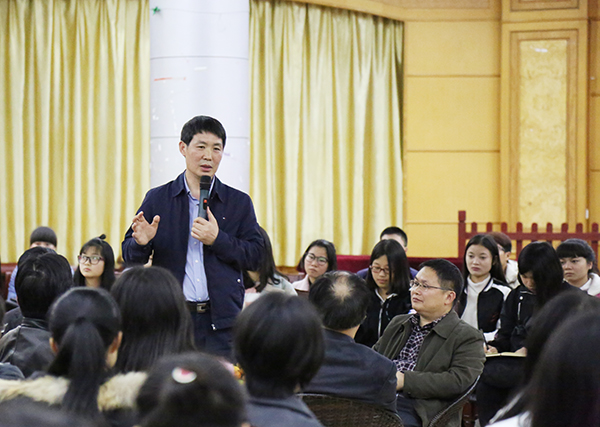 活动采取面对面的座谈会方式。校友们坐在报告厅中央,学生代表围成圈坐在校友周围,这种独特的方式拉进了校友与在校学生的距离,活动氛围轻松,谈话亲切。七位校友离校多年但仍心系母校,此次返校纷纷感慨母校变化。活动中,几位校友向在校生讲述他们当年在母校的求学经历,并分享他们在校时的趣事。在提问环节,校友们为在校学生解答了一些学习、生活、就业方面的问题,并激励在校学子努力学习,拼搏奋斗,希望学弟学妹们将来能有所成就。