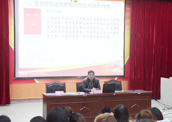 唐艳明生动地阐述了党的先进性的基本内涵及中国共产党保持先进性的基本要求和基本内容。他说:“我们必须牢记中国共产党的理想信念,不但在组织上入党,更重要的做到思想上入党和行动上入党,只有这样,才能保持党的先进性和纯洁性。”接着他引经据典,围绕思想、政治、组织、作风等方面来阐释保持党员的先进性和纯洁性的重要性和紧迫性。唐艳明强调,高校大学生要将党的先进性和纯洁性教育落到实处,把文化知识和道德修养紧密结合,把创新思维和社会实践紧密结合,把全面发展和个性发展紧密结合。唐艳明对大家提出四点殷切期望:“希望大家争做学习的模范,做开拓创新的模范,做服务实干的模范,做道德修养的模范。”