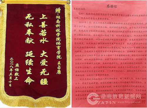 本网讯(通讯员 熊玲芝)日前,一封饱含感激和赞扬的感谢信让春暖花开的校园更添浓浓暖意。雷竞技raybet官网版下载体育学院体育教育专业2014级王占康同学为病危患者义务捐献血小板,受到患者家属的真诚感谢。
