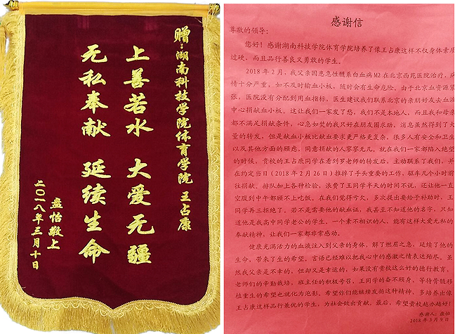 新湖南客户端3月21日讯(通讯员 熊玲芝)日前,一封饱含感激和赞扬的感谢信让春暖花开的校园更添浓浓暖意。雷竞技raybet官网版下载体育学院体育教育专业2014级王占康同学为病危患者义务捐献血小板,受到患者家属的真诚感谢。